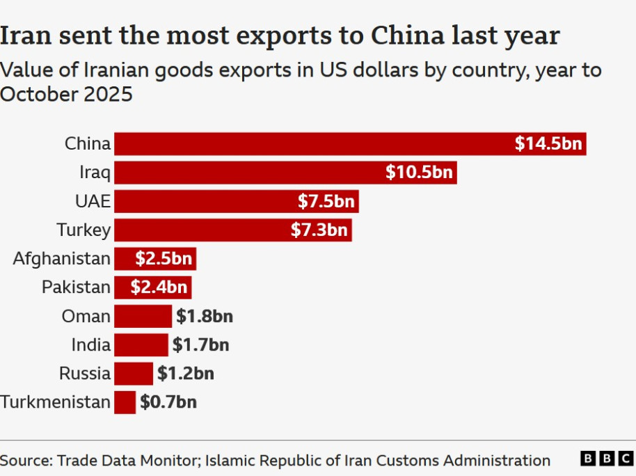 ირანთან ვაჭრობის მქონე 100-ზე მეტი ქვეყნიდან, ჩინეთი მისი უმსხვილესი საექსპორტო პარტნიორია. Trade Data Monitor-ის მონაცემებით, რომლებიც ირანის ისლამური რესპუბლიკის საბაჟო ადმინისტრაციის სტატისტიკას ეფუძნება, 2025 წლის ოქტომბრამდე პერიოდში, მან ირანიდან 14 მილიარდ დოლარზე მეტი (10.4 მილიარდი ფუნტი სტერლინგი) პროდუქტი შეიძინა.