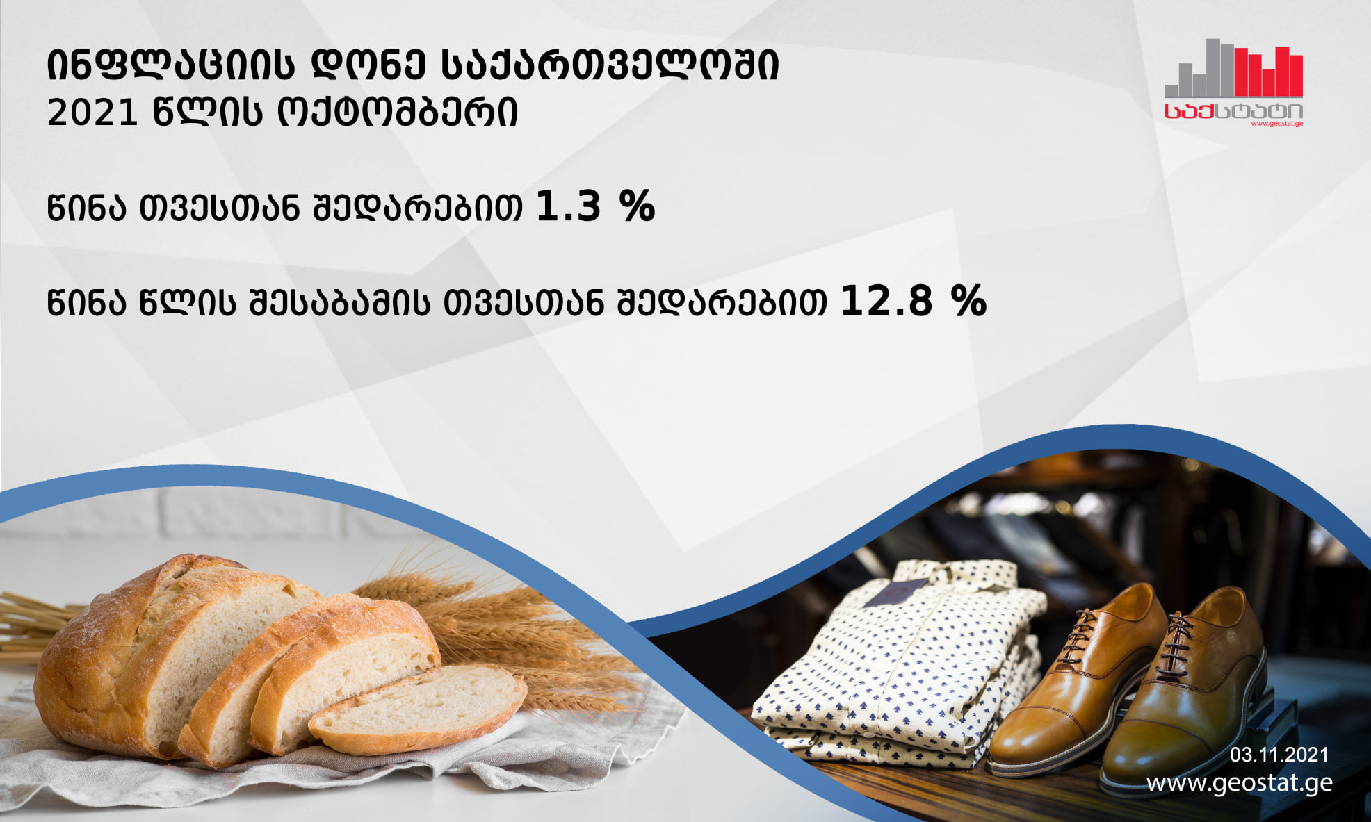 სტატისტიკის ეროვნული სამსახური საქართველოში ინფლაციის ახალ მაჩვენებელს აქვეყნებს. 2021 წლის ოქტომბერში წინა თვესთან შედარებით ინფლაციის დონემ საქართველოში 1.3 პროცენტი, ხოლო წლიური ინფლაციის დონემ 12.8 პროცენტი შეადგინა. რაც შეეხება საბაზო ინფლაციას, აღნიშნულმა მაჩვენებელმა 2021 წლის ოქტომბერში, გასულიწლის შესაბამის პერიოდთან შედარებით 6.3 პროცენტი შეადგინა, თამბაქოს გარეშე წლიურისაბაზო ინფლაციის მაჩვენებელი კი 6.2 პროცენტით განისაზღვრა. საქსტატის ცნობით, წლიური ინფლაციის ფორმირებაზე ძირითადი გავლენა იქონია ფასების ცვლილებამ შემდეგ ჯგუფებზე:სურსათი და უალკოჰოლო სასმელები: ჯგუფში ფასები გაიზარდა 18.4 პროცენტით, რაც წლიურ ინფლაციაზე 5.73 პროცენტული პუნქტით აისახა. ფასები მომატებულია შემდეგ ქვეჯგუფებზე: ბოსტნეული და ბაღჩეული -43.0 პროცენტი, ზეთი და ცხიმი - 31.6 პროცენტი, პური და პურპროდუქტები - 19.4 პროცენტი, რძე, ყველი და კვერცხი - 18.2 პროცენტი, შაქარი, ჯემი და სხვა ტკბილეული - 18.0პროცენტი, თევზეული - 16.0 პროცენტი, მინერალური და წყაროს წყალი, უალკოჰოლო სასმელებიდა ნატურალური წვენები - 13.0 პროცენტი, ხორცი და ხორცის პროდუქტები - 11.2 პროცენტი, ხილიდა ყურძენი - 9.3 პროცენტი, ყავა, ჩაი და კაკაო - 6.4 პროცენტი. ტრანსპორტის ჯგუფში ფასები გაიზარდა 19.6 პროცენტით, რაც 2.4 პროცენტული პუნქტით აისახა მთლიანი ინდექსის ზრდაზე. ფასები გაიზარდა პირადი სატრანსპორტო საშუალებების ექსპლუატაციაზე 28.9 პროცენტით და სატრანსპორტო მომსახურებაზე 2.8 პროცენტით. ამასთან,ფასები შემცირდა სატრანსპორტო საშუალებების შეძენაზე _ -1.3 პროცენტი. საცხოვრებელი, წყალი, ელ.ენერგია, აირი: ჯგუფში ფიქსირდება ფასების 11.9 პროცენტიანი მატება, რაც 1.75 პროცენტული პუნქტით აისახა წლიურ ინფლაციაზე. ფასები მომატებულიაქვეჯგუფებზე: ელექტროენერგია, აირი და სათბობის სხვა სახეები - 13.9 პროცენტი, საცხოვრებლის მიმდინარე მოვლა და შეკეთება - 7.3 პროცენტი, წყალმომარაგება და საცხოვრებელთან დაკავშირებული სხვა მომსახურება - 4.5 პროცენტი; ჯანმრთელობის დაცვა: ჯგუფში ფასები მომატებულია - 8.4 პროცენტით. შესაბამისად, ჯგუფისწვლილმა წლიურ ინდექსში 0.65 პროცენტული პუნქტი შეადგინა. ფასები გაზრდილია სამედიცინოპროდუქციის, აპარატურის და მოწყობილობის - 12.7 პროცენტი, საავადმყოფოების მომსახურების - 5.3 პროცენტი და ამბულატორიული სამედიცინო მომსახურების - 3.6 პროცენტი, ქვეჯგუფებზე. ყოველთვიური ინფლაციის მაჩვენებლის ფორმირებაზე ძირითადი გავლენა იქონია ფასებისცვლილებამ შემდეგ ჯგუფებზე:სურსათი და უალკოჰოლო სასმელები: ჯგუფში ფასები გაიზარდა 3.0 პროცენტით, რ
