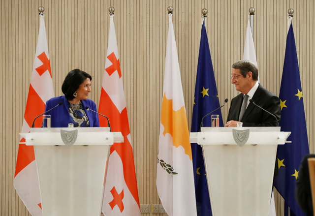 საქართველოს და კვიპროსის რესპუბლიკის პრეზიდენტებმა, პირისპირ და გაფართოებულ ფორმატში გამართული შეხვედრების შემდეგ, დღეს პრესისათვის პრესკონფერენცია გამართეს და მოლაპარაკებების შედეგების შესახებ ისაუბრეს. საქართველოს პრეზიდენტის თქმით, ევროკავშირის ფორმატში საქართველოსათვის კვიპროსის მხარდაჭერა ძალიან მნიშვნელოვანია „ჩვენ ორ ქვეყანას აქვს საერთო ისტორია, რელიგია და ძალიან ბევრი გამოწვევა. პატარა ქვეყნისთვის ეს ძალიან მძიმე სურათია, მაგრამ ჩვენ ვუმკლავდებით ამ გამოწვევებს და შეიძლება ერთი მეორესთან ვპოულობთ რაღაც ახალ ძალას. მე მინდა, პირველ რიგში, გითხრათ, თუ რამდენად ვაფასებ პირადად მე, საქართველოს მოსახლეობა და საქართველოს საპატრიარქო იმას, რომ კვიპროსმა გადმოგვცა მიწა იმისთვის, რათა იმ ადგილას, სადაც მე-10 საუკუნეში ქართული მონასტერი, სასულიერო კერა არსებობდა, ახალი მონასტერი აშენდეს. ეს ძალიან სიმბოლური ნაბიჯია, რამეთუ ჩვენ უფრო მიჩვეული ვართ იმას, რომ გვართმევენ ტერიტორიებს, ვიდრე იმას, რომ გვჩუქნიან ტერიტორიებს და ამისთვის დიდი მადლობა მინდა გითხრათ და ვისურვო, რომ ეს იყოს სწორედ ახალი ეპოქის სიმბოლო და ჩვენ მომავალ წლებში ვნახოთ ბევრად მეტი დაბრუნებული ტერიტორიები“, - აღნიშნა პრეზიდენტმა. მისივე თქმით, საქართველო აფასებს კვიპროსის მუდმივ მხარდაჭერას ქვეყნის სუვერენიტეტის, ტერიტორიული მთლიანობისა და ევროინტეგრაციის გზის მიმართ. „ეს ალბათ ისაა, რაც ყველაზე მნიშვნელოვანია ჩვენთვის, რომ ამ განსაცდელში ვიცოდეთ ის ქვეყნები, რომლებიც ამ გზაზე მხარს გვიჭერენ და გვიმყარებენ. საქართველო, თავის მხრივ, მხარს უჭერს კვიპროსის სუვერენიტეტსა და ტერიტორიულ მთლიანობას, რაც განსაზღვრულია საერთაშორისო სამართლით და ევროკავშირისა და გაეროს უშიშროების საბჭოს მთავარი რეზოლუციებით. ეს არის ჩვენი მსოფლიოს საერთო სამართალი, რომელსაც ყველა უნდა ვექვემდებარებოდეთ. მომავალ წელს საქართველოსა და კვიპროსს შორის დიპლომატიური ურთიერთობების დამყარების 30 წელი სრულდება და ალბათ, ეს კარგი მომენტია, რომლითაც უნდა ვისარგებლოთ - ახალ საფეხურზე ავიყვანოთ ჩვენი ორმხრივი ურთიერთობები და დავიწყოთ ახალი ფურცლით ეს ურთიერთობები, რომლებიც შეგვიძლია ბევრი მიმართულებით გავაძლიეროთ. ჩვენი შეხვედრისას განვიხილეთ ის, რაც საქართველოსთვის ყველაზე მძიმე ხვედრია - ეს არის ოკუპაცია - ჩვენი ქვეყნის ტერიტორიის 20% და მინდა, ხაზი გავუსვა იმას, რასაც ხაზი გავუსვი თქვენთან პირადად და გაფართოებული შეხვედრისას - პანდემიამ კიდევ უფრო გაართულა და დ