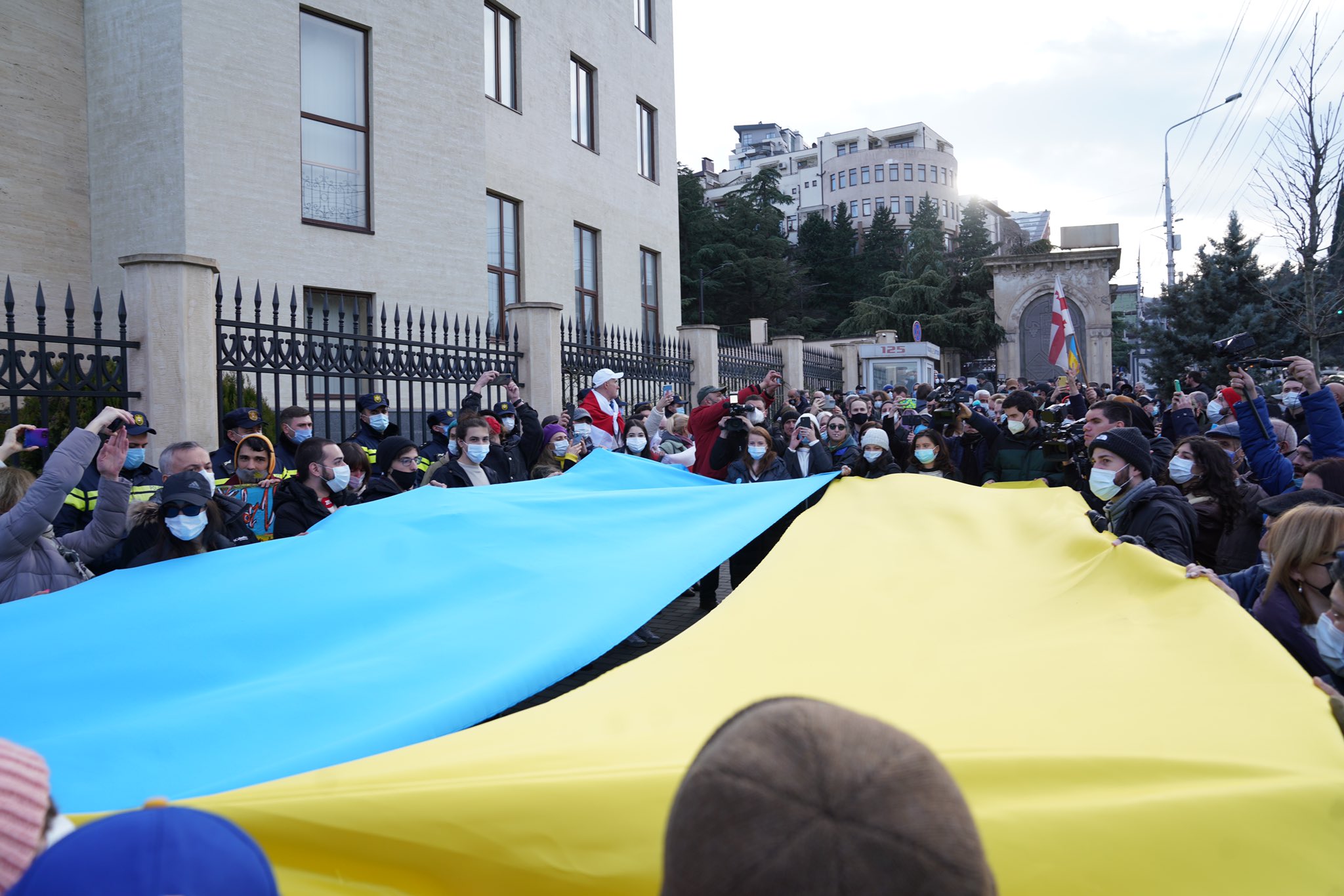 უკრაინის მხარდამჭერი აქცია თბილისში, უკრაინის საელჩოსთან 23 იანვარს გაიმართა. საელჩოსთან შეკრიბნენ საზოგადოებრივი ჯგუფები, პოლიტიკური პარტიების წარმომადგენლები, აქტივისტები. აქციის მონაწილეებმა ადგილზე უკრაინისა და საქართველოს ჰიმნები ააჟღერეს და ორივე ქვეყნის დროშები გაშალეს. წარმოადგინეს ბანერები წარწერით - ,,უკრაინა და საქართველო რუსეთის გარეშე”, ,,დიდება უკრაინას”, ,,არასდროს დავბრუნდებით საბჭოთა კავშირში”. ,,ეს არის სოლიდარობის აქცია ჩვენი ისტორიული მეგობრისა და სტრატეგიული პარტნიორის მიმართ, რომელიც იმავე გამოწვევების წინაშე დგას როგორშიც იდგა 2008 წელს საქართველო. როდესაც საქართველო-უკრაინის საკითხი ერთად წყდება საერთაშორისო დონეზე, ქართული ხელისუფლების დუმილი არის ანტისახელმწიფოებრივი და ეწინააღმდეგება საქართველოს მომავალ უსაფრთხოებას. ყველაფერი ეს ჯდება მხოლოდ რუსეთის ინტერესებში”, - განაცხადა სამოქალაქო აქტივისტმა ნიკა ფარულავამ. რადიო თავისუფლების ცნობით, აქციის მონაწილეებს სიტყვით მიმართა და ქართველი ხალხის მიმართ მადლიერება გამოხატა უკრაინის საელჩოს წარმომადგენელმა, ანდრეი კასიანოვმა. „რუსეთის სამხედრო აგრესიის პირობებში დღეს მნიშვნელოვანია თითოეული უკრაინელის, თითოეული ქართველის, უკრაინის თითოეული მხარდამჭერის ხმა. ძვირფასო ქართველებო, უკრაინა განსაკუთრებით მადლიერია ქართველი ხალხის, თქვენი სოლიდარობისთვის. დღეს თქვენი მოსვლა და ყოფნა აქ [უკრაინის საელჩოსთან] დემონსტრირებაა ქართველი ხალხის შეუქცევადი ერთგულებისა უკრაინელი ხალხის მისამართით... საქართველოს გაუმარჯოს! უკრაინას გაუმარჯოს!“, - აღნიშნა კასიანოვმა. 21 იანვარს, მოძრაობა „სირცხვილიამ“ ღია წერილით მიმართა საქართველოში უკრაინის ელჩსა და საელჩოს თანამშრომლებს. წერილში აღნიშნული იყო, რომ უკრაინა და საქართველო ერთად დგანან თავიანთი მშვიდობის, უსაფრთხოების, დემოკრატიისა და ევროატლანტიკური მომავლისთვის. აქციის მონაწილეები აღნიშნავდნენ, რომ საქართველოს ხელისუფლება არასაკმარის მხარდაჭერას გამოხატავს სტრატეგიული პარტნიორი ქვეყნის, უკრაინის მისამართით, რომელიც ახლა რუსეთის მხრიდან მორიგი სამხედრო თავდასხმის რეალური საფრთხის წინაშე დგას. აქციის მონაწილეებმა გაიხსენეს 2008 წელი, როდესაც „უკრაინის მაშინდელი პრეზიდენტი, ვიქტორ იუშჩენკო, ევროკავშირის რამდენიმე ქვეყნის ლიდერებთან ერთად, თბილისში სოცოცხლის რისკის ფასად ჩამოვიდა“. „უნდა ვაჩვენოთ მსოფლიოს, რომ, მიუხედავად ჩვენთვის არალეგიტიმური ხელისუფლების ასე მოქცევისა,